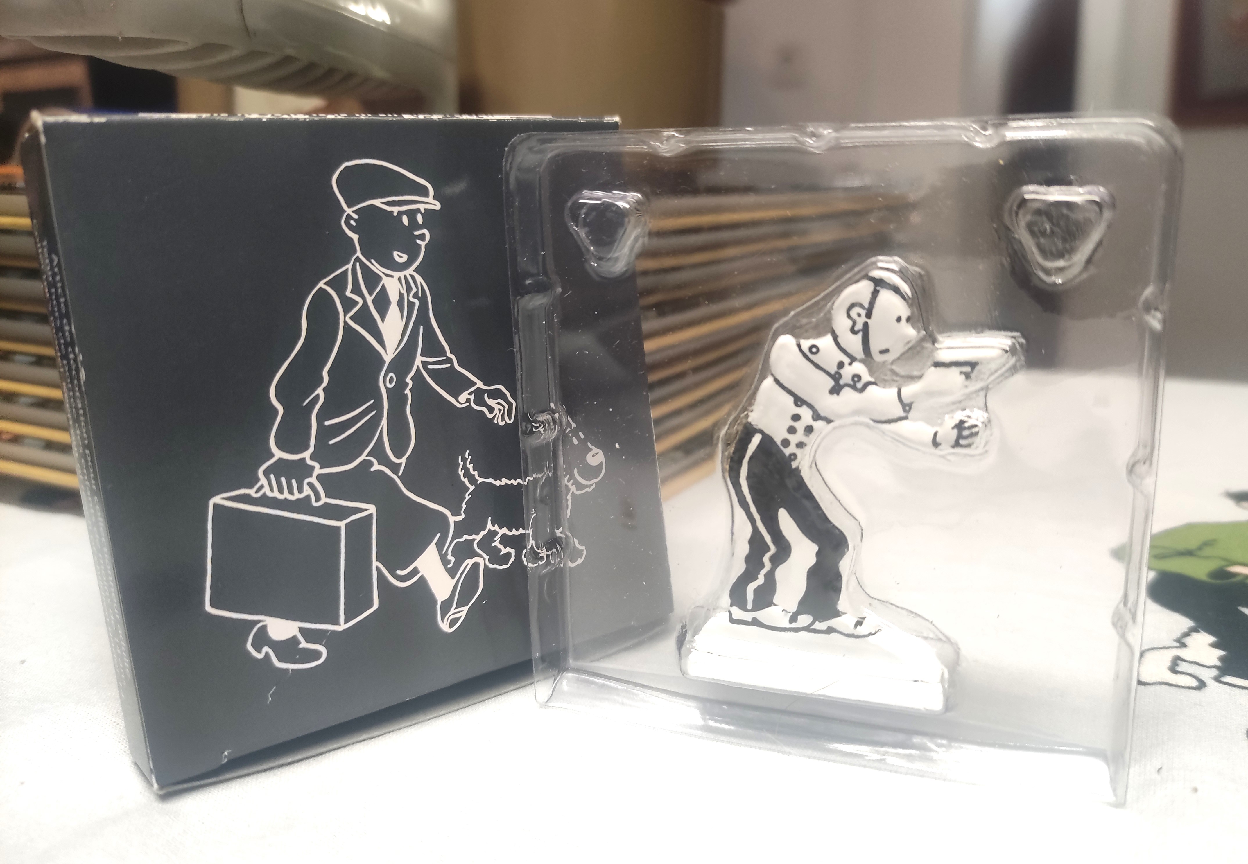 Figura de silueta plana de l´aventura de Tintín a Amèrica en blanc i negre.