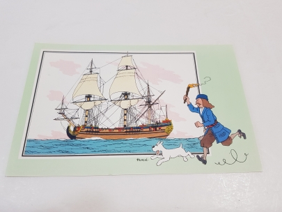 Crom del àlbum pertanyent a la Marina en el qual Tintín i Milú apareixen vestits i costumizados relacionats amb el vaixell que apareix dibuixat i la seva època.