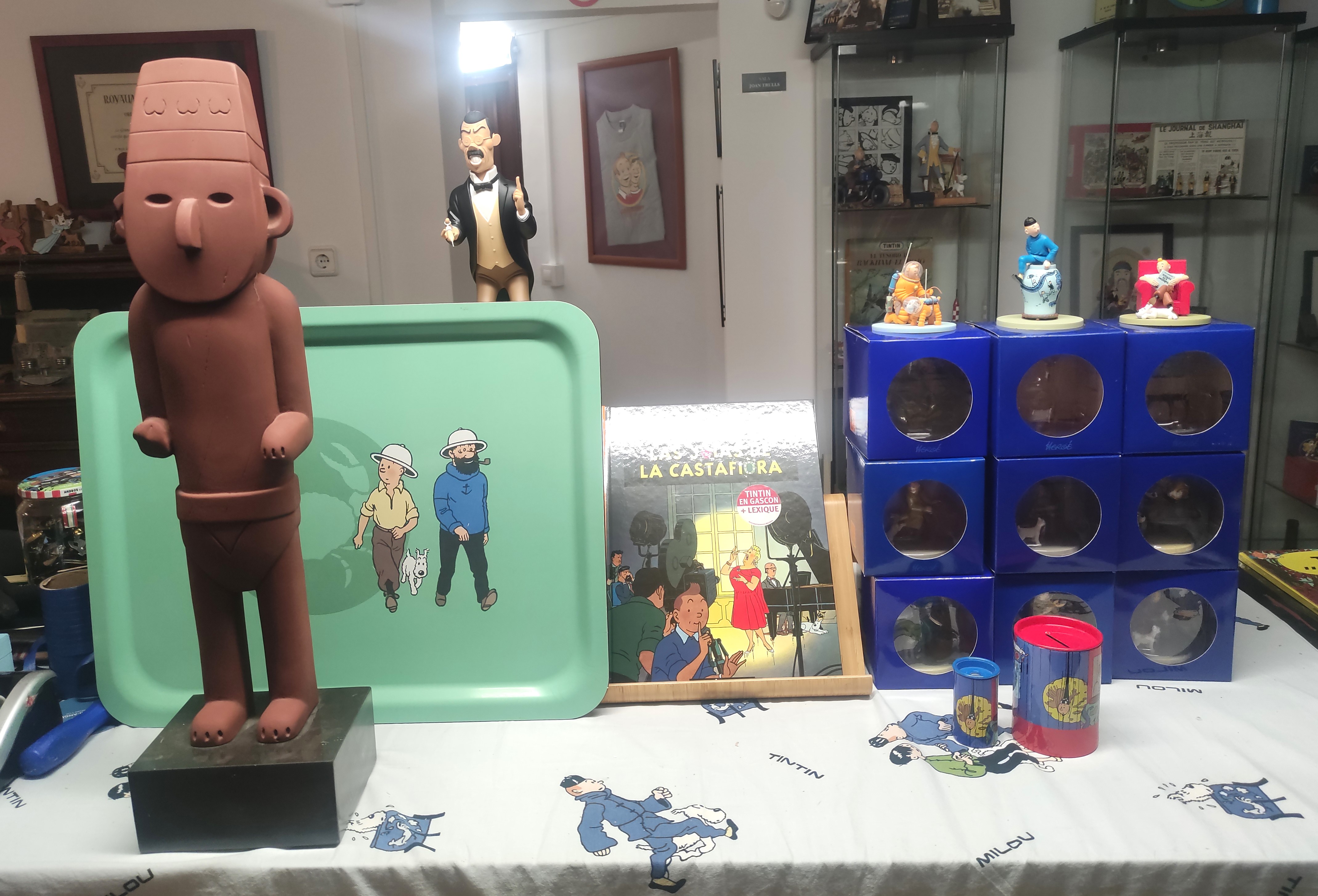 Des de figures de resina (Feliche Museu Hergé, Mitsuhirato, etc.), llibres de noves traduccions, (Gascón) passant per alguns models difícils de trobar de la col·lecció Cofres així com objectes d'ús domèstic com una safata de servei de menjar i rellotges vintage de magnífica creació.