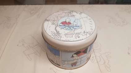 Caja redonda metálica vacía en la que se comercializaban chocolatinas.