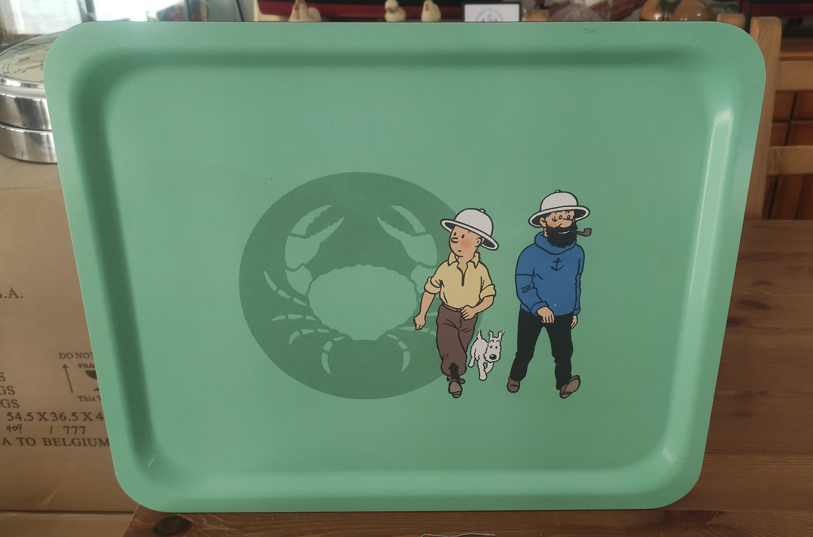 Bandeja metálica en buen estado cuya temática es El Cangrejo de las Pinzas de Oro.
