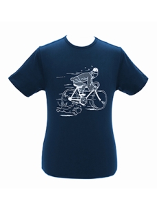 Camiseta azul marino de manga corta serigrafiada con la imagen de Tintín en bicicleta acompañado por milú portando un paquete. Imagen perteneciente al libro de El Loto Azul.