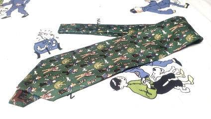 Corbata de color verde inglés con diferentes imágenes de acciones de Tintín que aparecen en la aventura de América